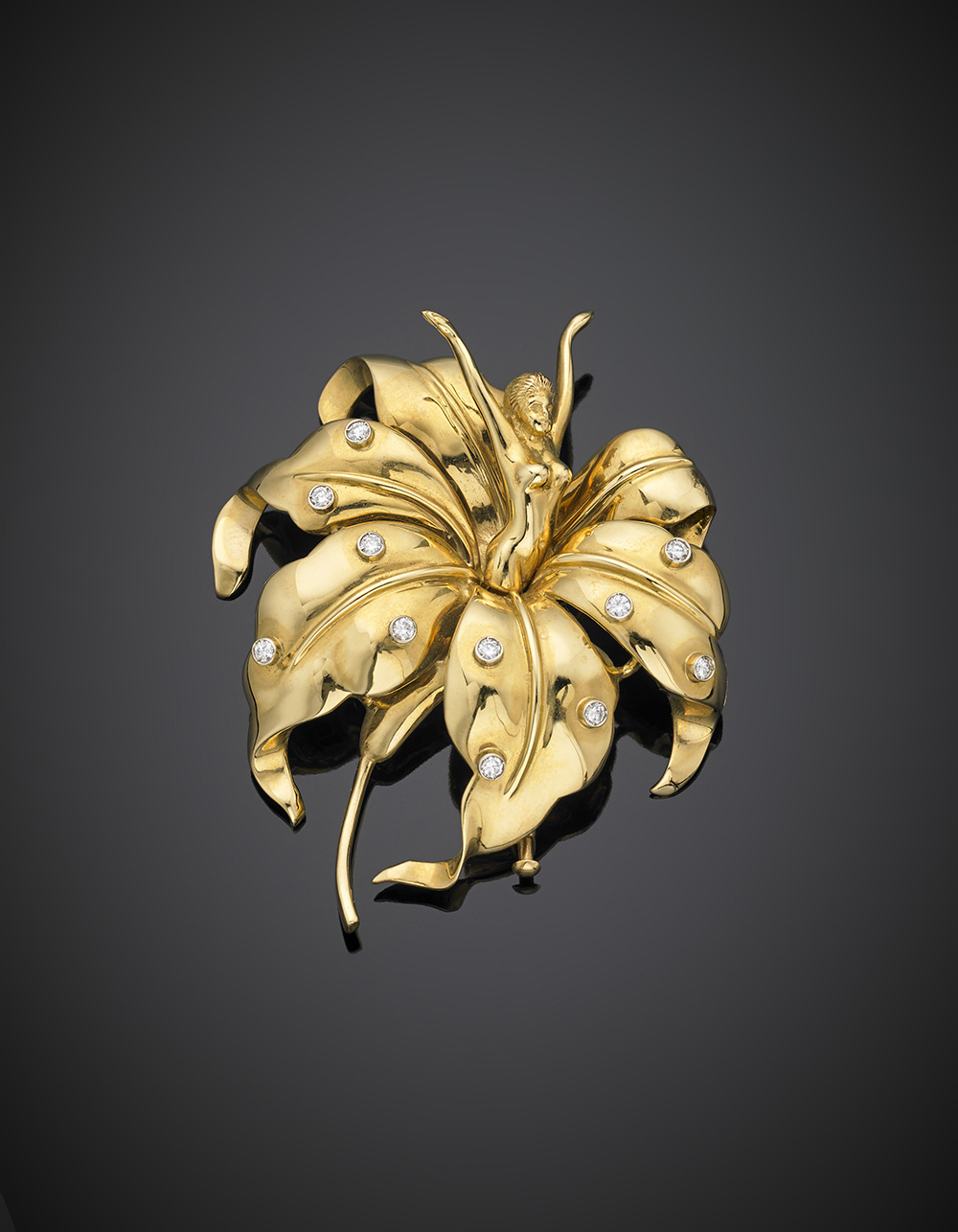 Spilla a fiore in oro giallo con figurina femminile, rifinita in diamanti, g 42,59, lungh. cm 6,9, largh. cm 5,6 circa. In scatola originale