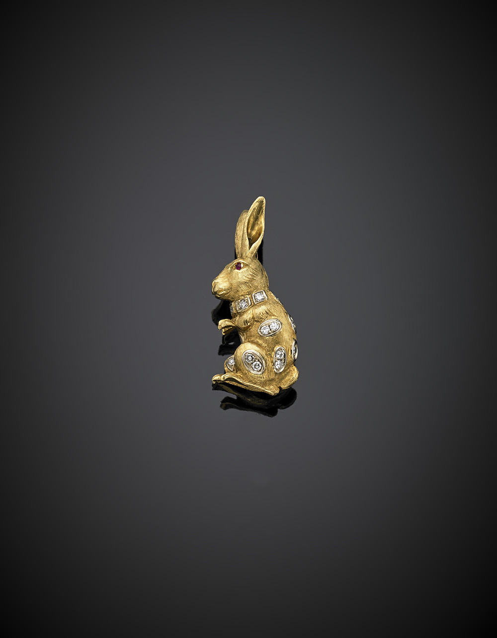 Lot 853 | BUCCELLATIBroche in oro giallo a guisa di coniglio con diamanti e rubini, g...