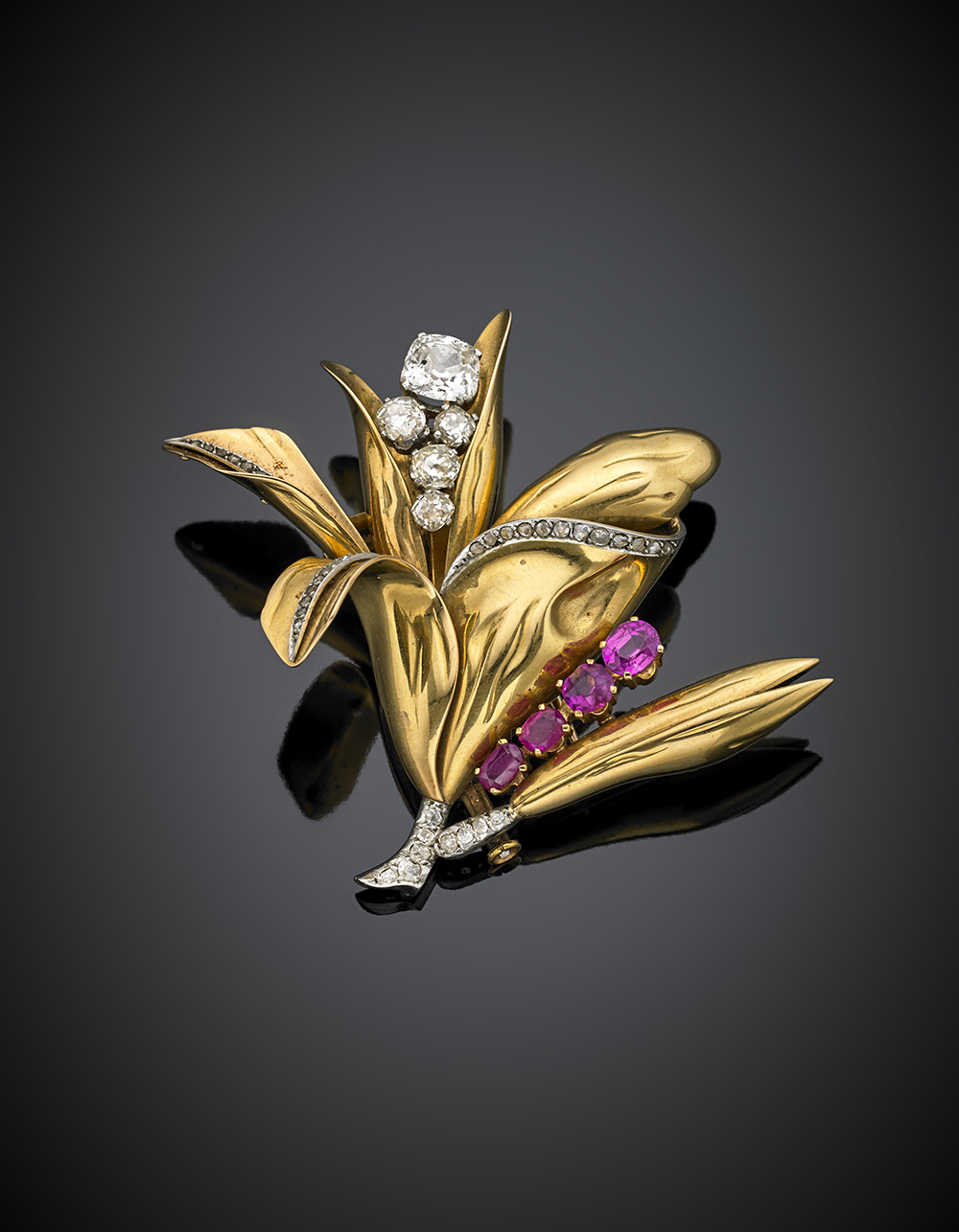 Broche a fiore in oro giallo e bianco rifinita in diamanti e rubini a cuscino, diamanti per complessivi ct. 1,50 circa e rubini per complessivi ct. 1,40 circa, g 24,11, lungh. cm 5,20, largh. cm 6,20 circa.