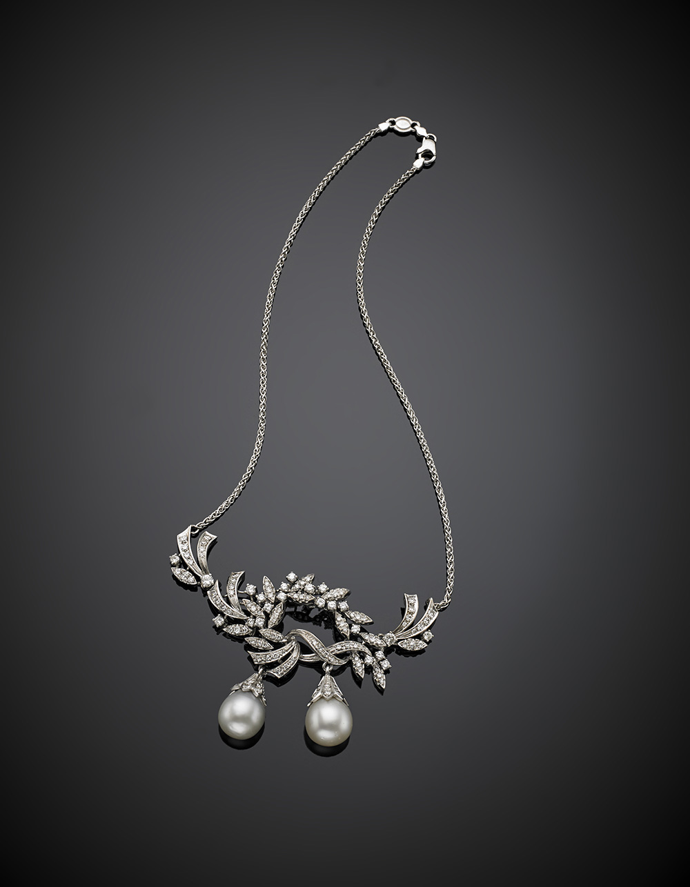 Collier in oro bianco con centrale floreale in diamanti e due perle australiane pendenti, g 29,95, lungh. cm 41 circa.