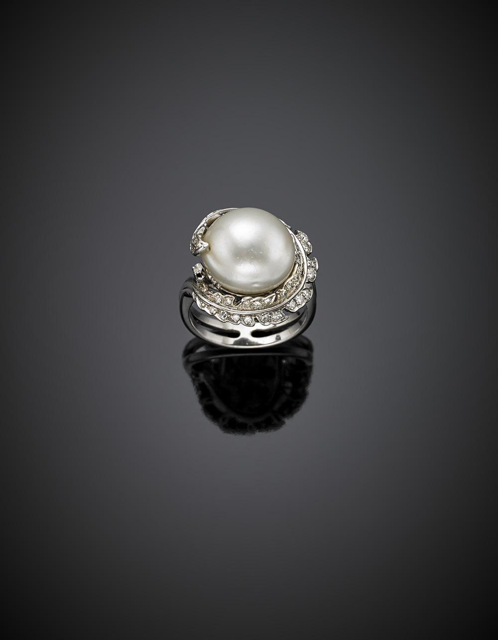 Anello in oro bianco con diamanti su motivo a foglia a contornare perla bianca di mm 13.70 circa, g 12,23 misura 16/56.