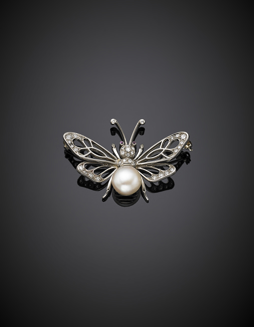 Platinum pearl and diamond bee brooch, g 8.99, width cm 4.4 circa.