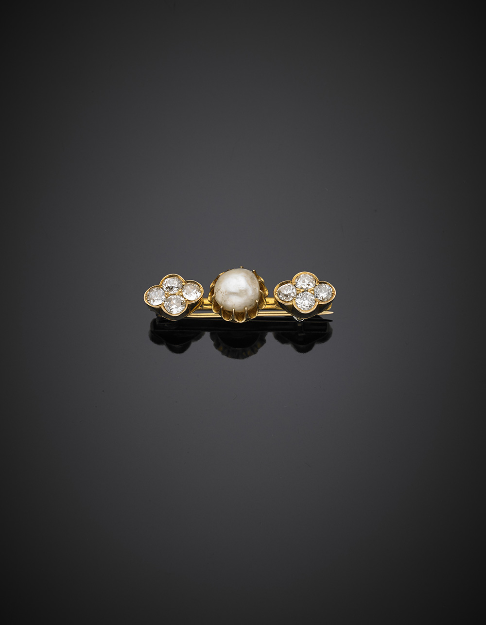 Spilla in oro giallo con perla naturale d'acqua salata di mm 8,61 circa, rifinita con diamanti rotondi, g 9,31, lungh. cm 3,60 circa.