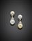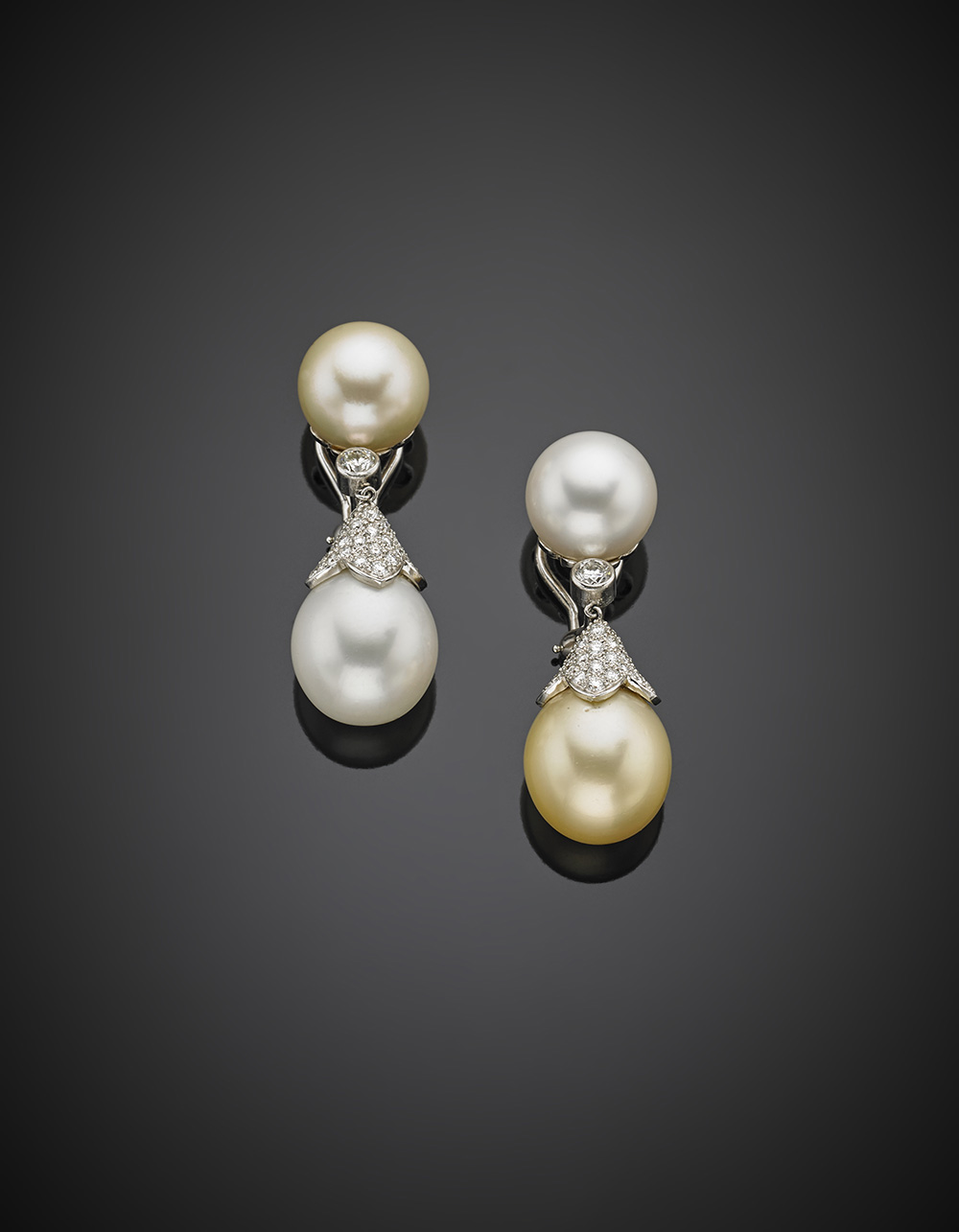 White and golden South sea pearl and diamond white gold pendant earrings, pearl diam. from mm 13.30 to mm 14.77, g 28.87, length cm 4.30 circa.