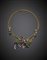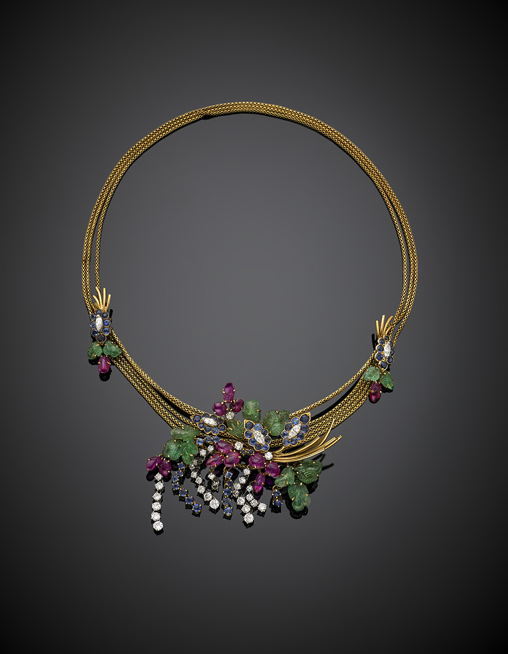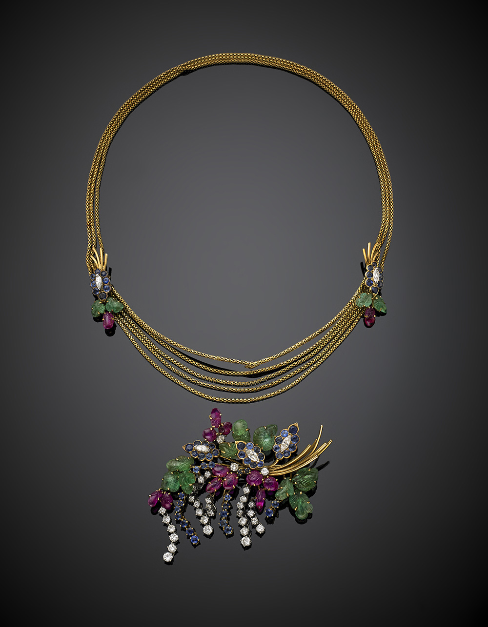 Collier scomponibile in broche floreale e collier in oro giallo con diamanti a navette e rotondi per complessivi ct. 2 circa, zaffiri rotondi per complessivi ct. 4 circa, rubini e smeraldi scolpiti, largh. broche cm 7, complessivi g 46,92, lungh. cm 40,60 circa. In custodia di Wolfers Freres