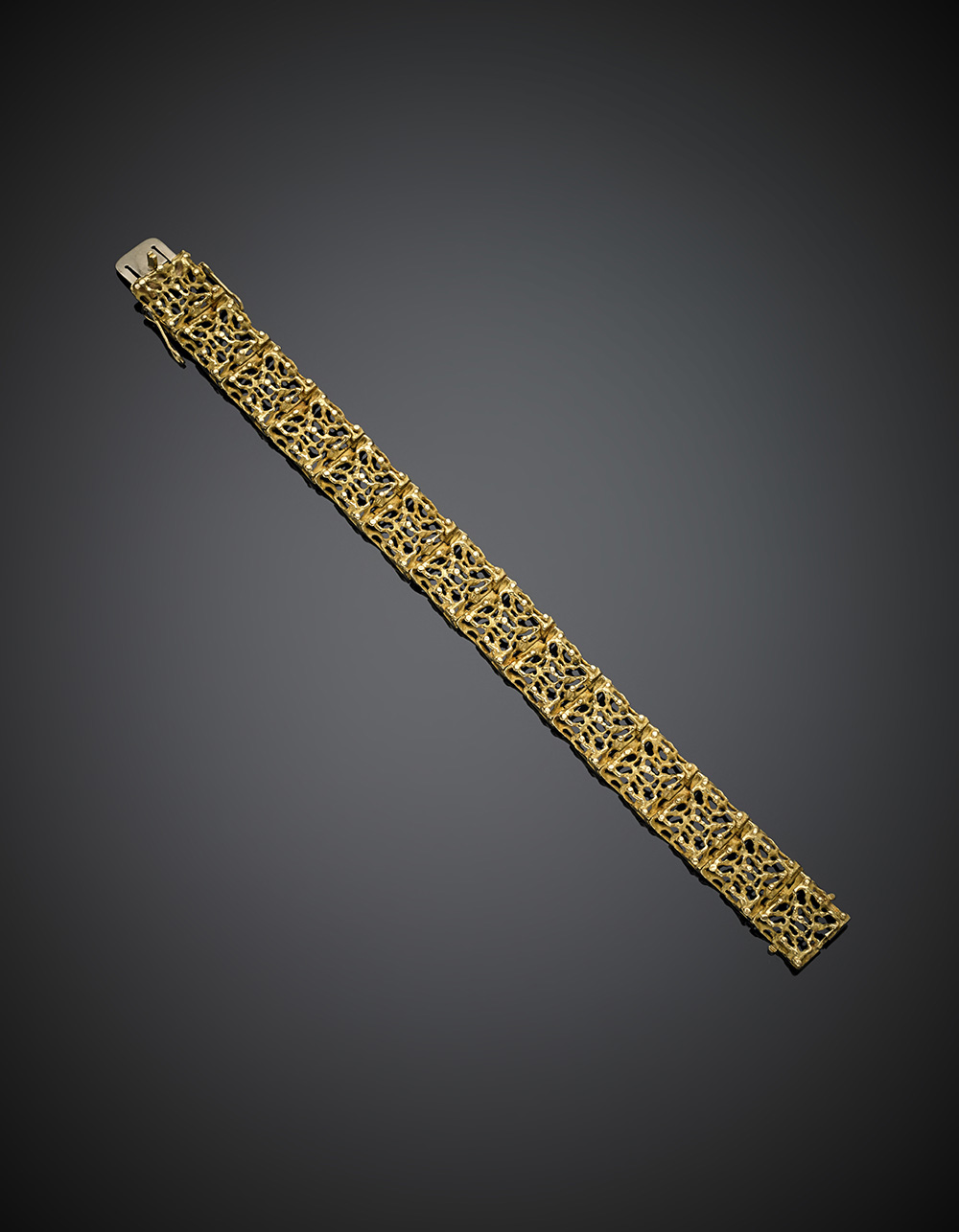 Bracciale a moduli battuti in oro giallo, g 39,99, lungh. cm 19,8 circa.