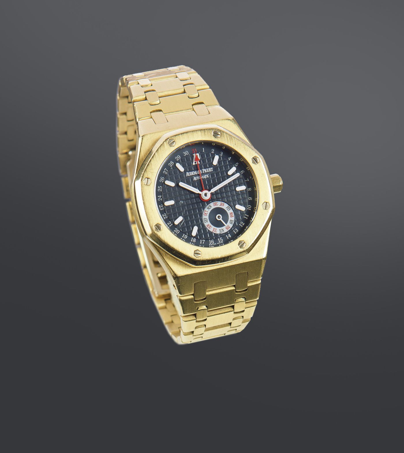 AUDEMARS PIGUET Royal Oak calendario annuale serie recente Diam. 37 Storico modello della maison di Le Brassus che deve la sua linea al disegno del vivo di volata dei cannoni delle navi classe HMS ROYAL OAK E KING GEORGE V della marina reale britannica Cassa in oro giallo in tre parti con bracciale integrato, lunetta ottagonale fermata da viti passanti; quadrante lavorato con decoro grande tapis Movimento a carica automatica calibro 2224 con funzione ore, minuti calendario (data mese)