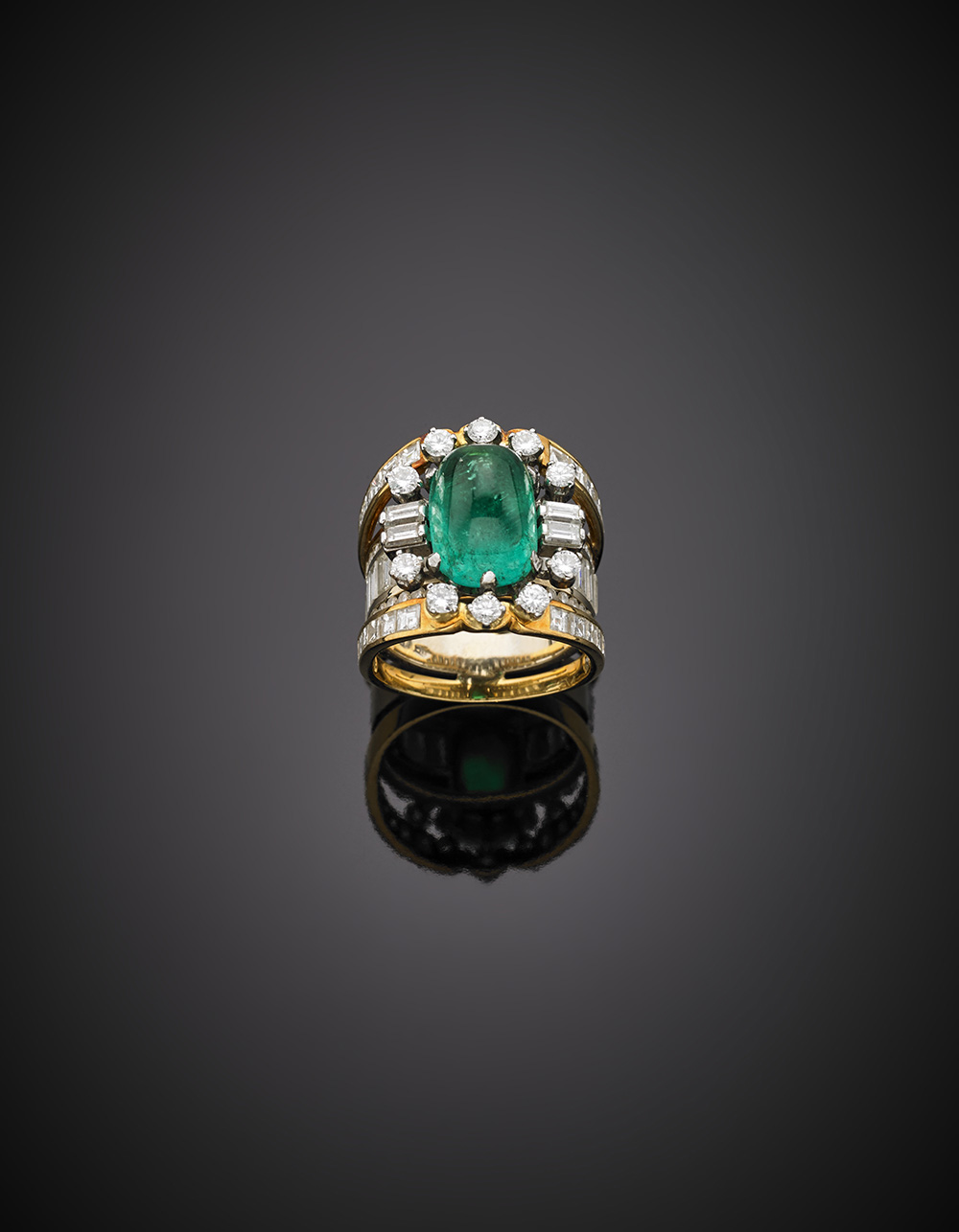 Anello in oro giallo e bianco con diamanti rotondi, calibré e baguette a rifinire uno smeraldo cabochon di ct. 8 circa, diamanti per complessivi ct. 3,50 circa, g 14,94 misura 13/53.