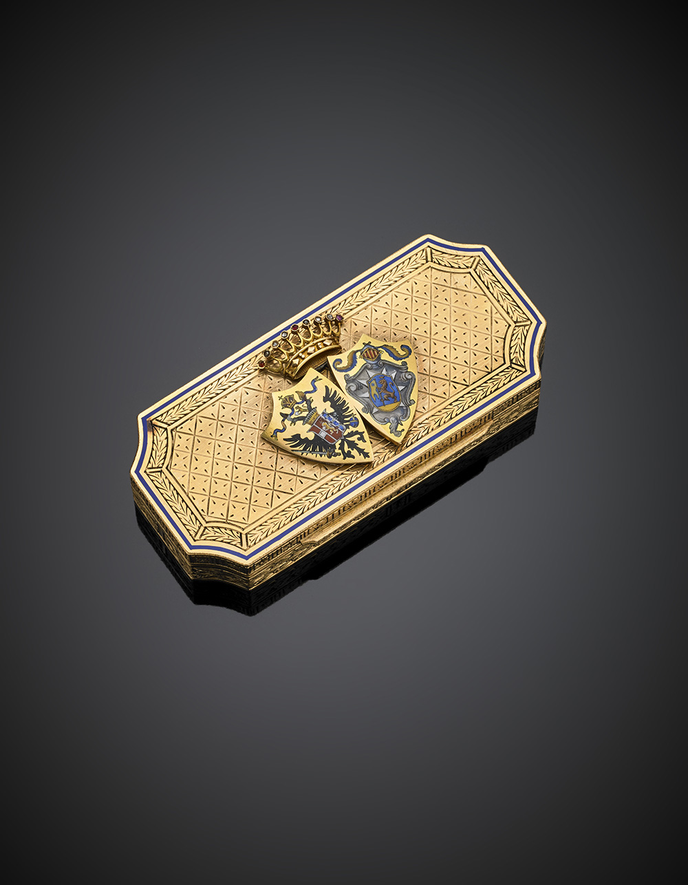Yellow etched gold and blue enamel case, with two polychrome heraldic coat of arms on the cover, the crown accented with colourless gems and rubies, g 112.74, length cm 8.90, width cm 4.20, h cm 1.70 circa.