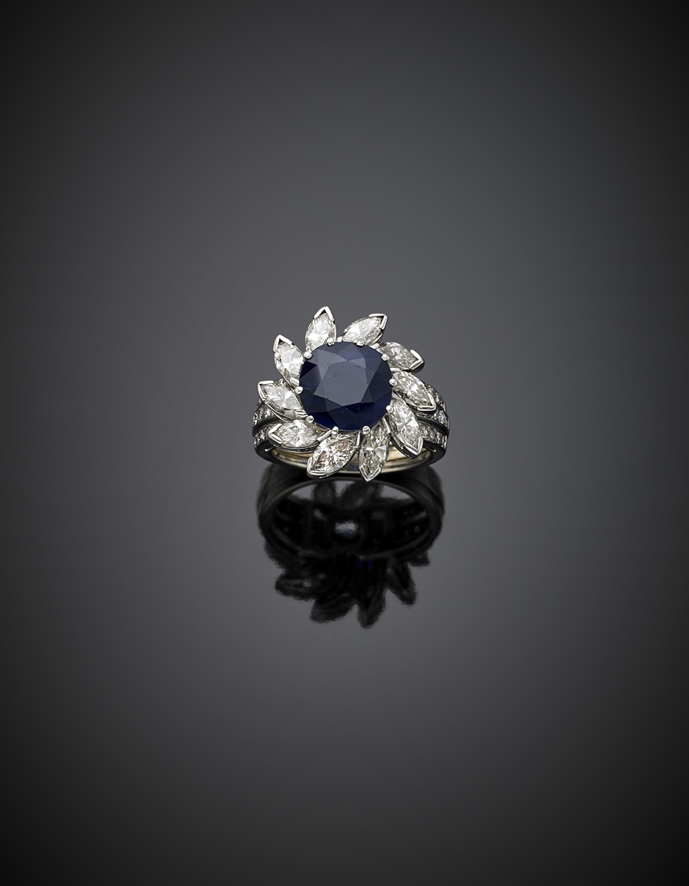 Anello in oro bianco con diamanti a navette a contornare zaffiro a cuscino/rotondo di ct. 4,80 circa, g 10,68 misura 13/53.