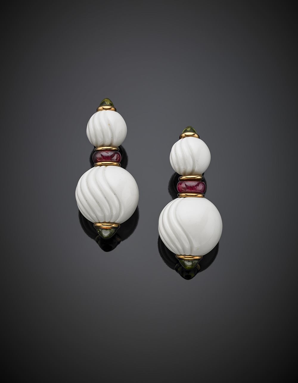 Orecchini pendenti "Chandra" in oro giallo, doppia boule in porcellana bianca, peridoti cabochon e boule di tormaline rosa, g 38,66, lungh. cm 5,10 circa. Firmati Bvlgari. In custodia originale