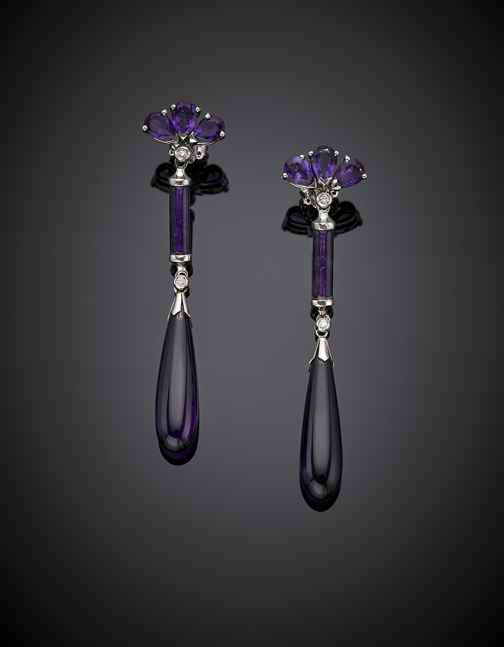 Orecchini lunghi, pendenti in oro bianco con ametiste a goccia, a baton e goccia cabochon, diamanti a rifinirli, g 13,26, lungh. cm 7 circa.