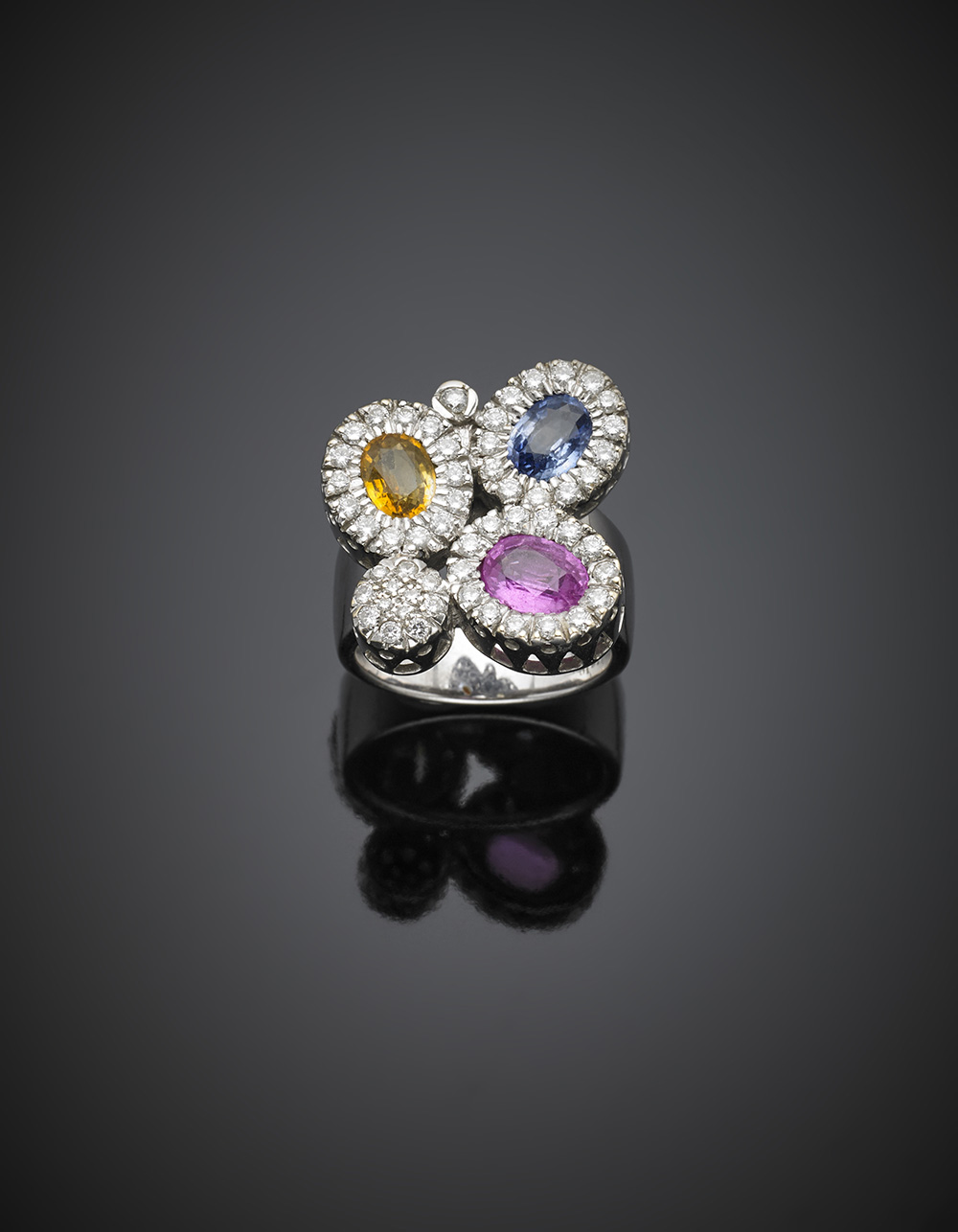 Anello in oro bianco a trifoglio con diamanti a rifinire e contornare tre zaffiri ovali: blu giallo e rosa,zaffiri per complessivi ct. 3,10 circa, g 15,52 misura 15/55.