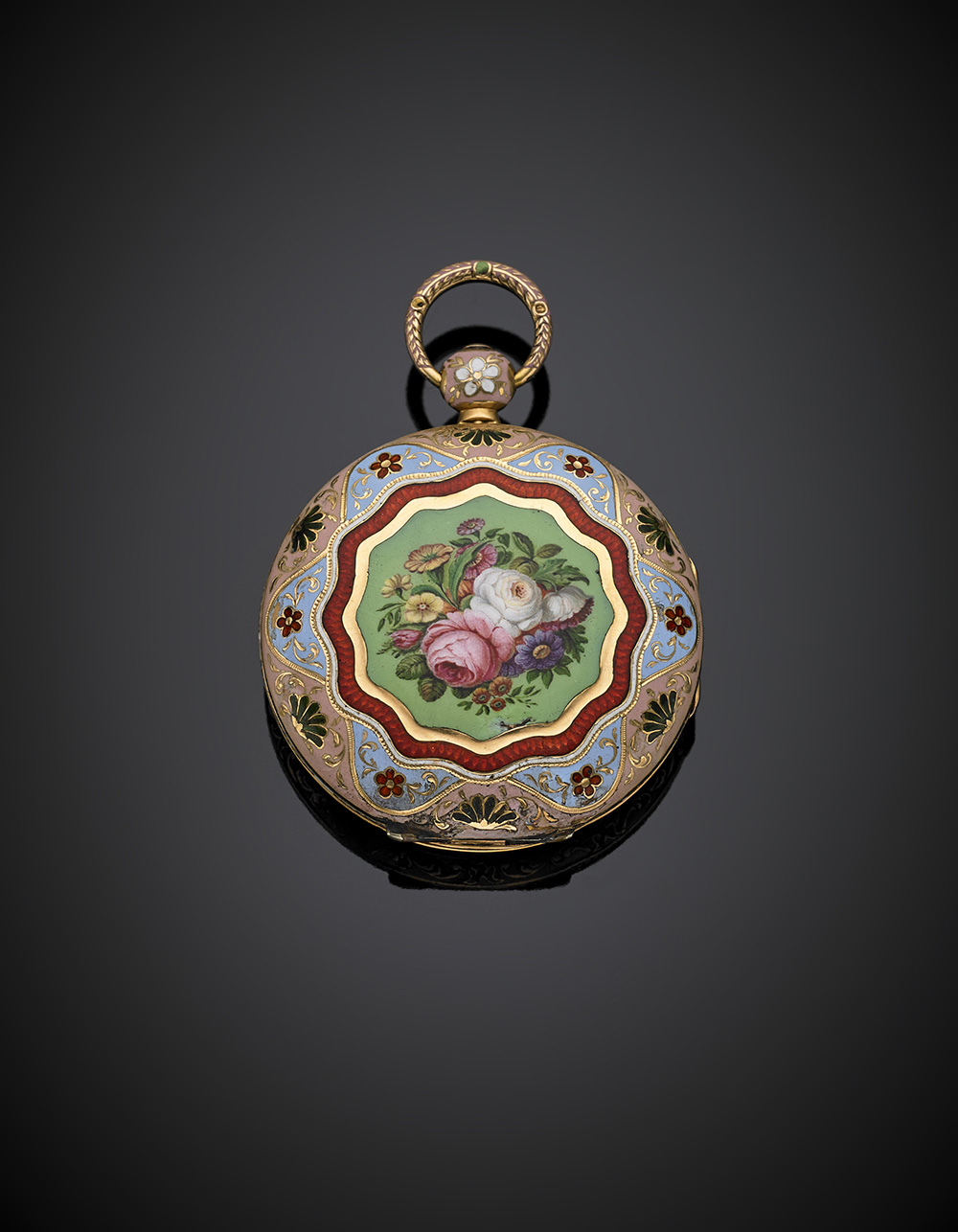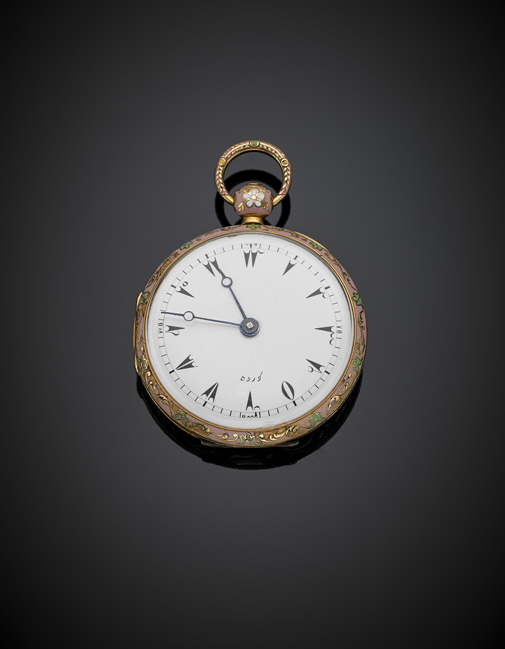 Orologio da tasca in oro giallo con bouquet e contorno in smalti policromi, realizzato per il mercato turco, g 57,69, lungh. cm 6,3 circa. Cassa e movimento firmati Le Roy à Paris, n°5696. (lievi difetti)