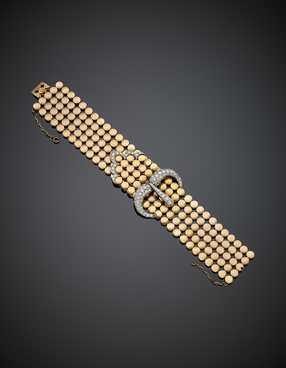 Yellow gold four strand flat bead strap bracelet with white gold diamond buckle and details,, in all ct. 1.20 circa, g 99.19, length cm 19.5, h cm 4 circa. In Pennisi case (slight defects)
