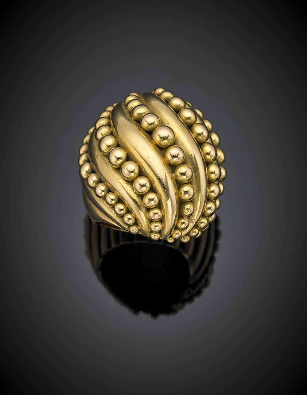 Yellow gold dome ring with a bead and curving rib alternated motiv, g 37.60 size 13/53.