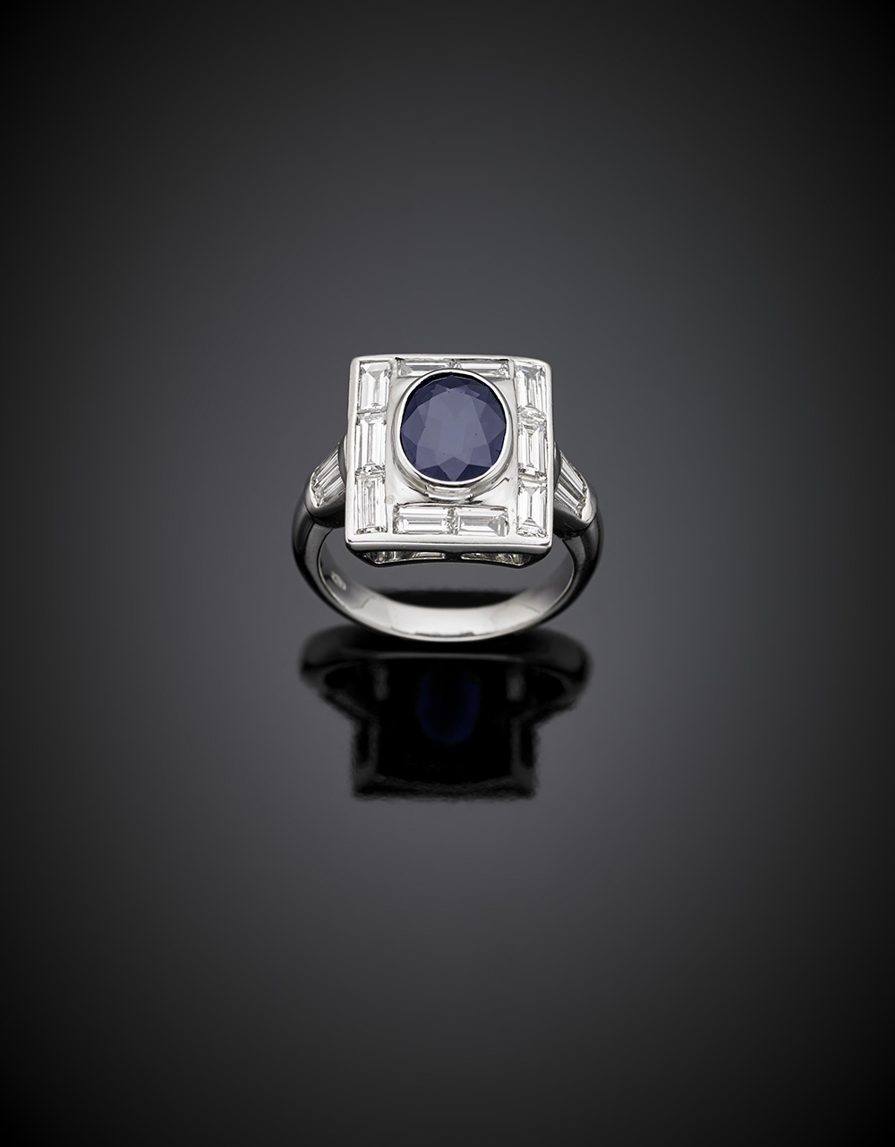 Anello in oro bianco con zaffiro di ct. 2,10 circa ovale e diamanti baguette per complessivi ct. 1 circa a incorniciarlo, g 10,3 misura 17/57.