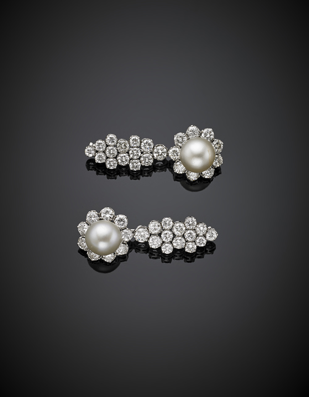 White gold, diamond and natural salt water pearl double brooch, pearl diam. mm 9.75 circa, diamonds, in all ct. 7 circa, g 15.15, length cm 3.80 circa.