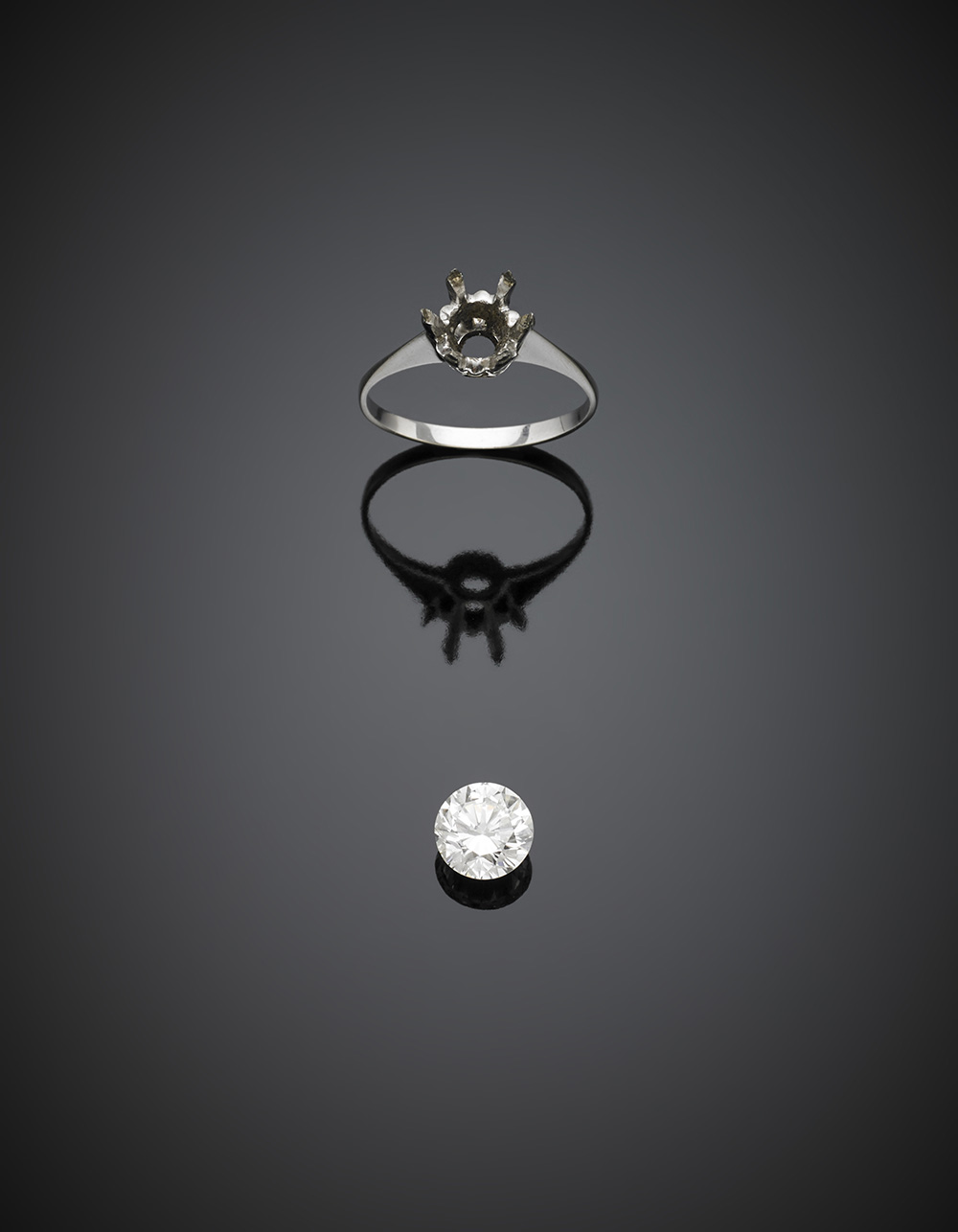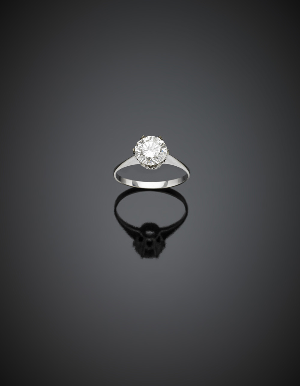 Anello in oro bianco con diamante solitario rotondo taglio a brillante di ct. 1,54, g 2,36 misura 14/54. Accompagnato da certificato del Gemmologo GIA William Mezzetti