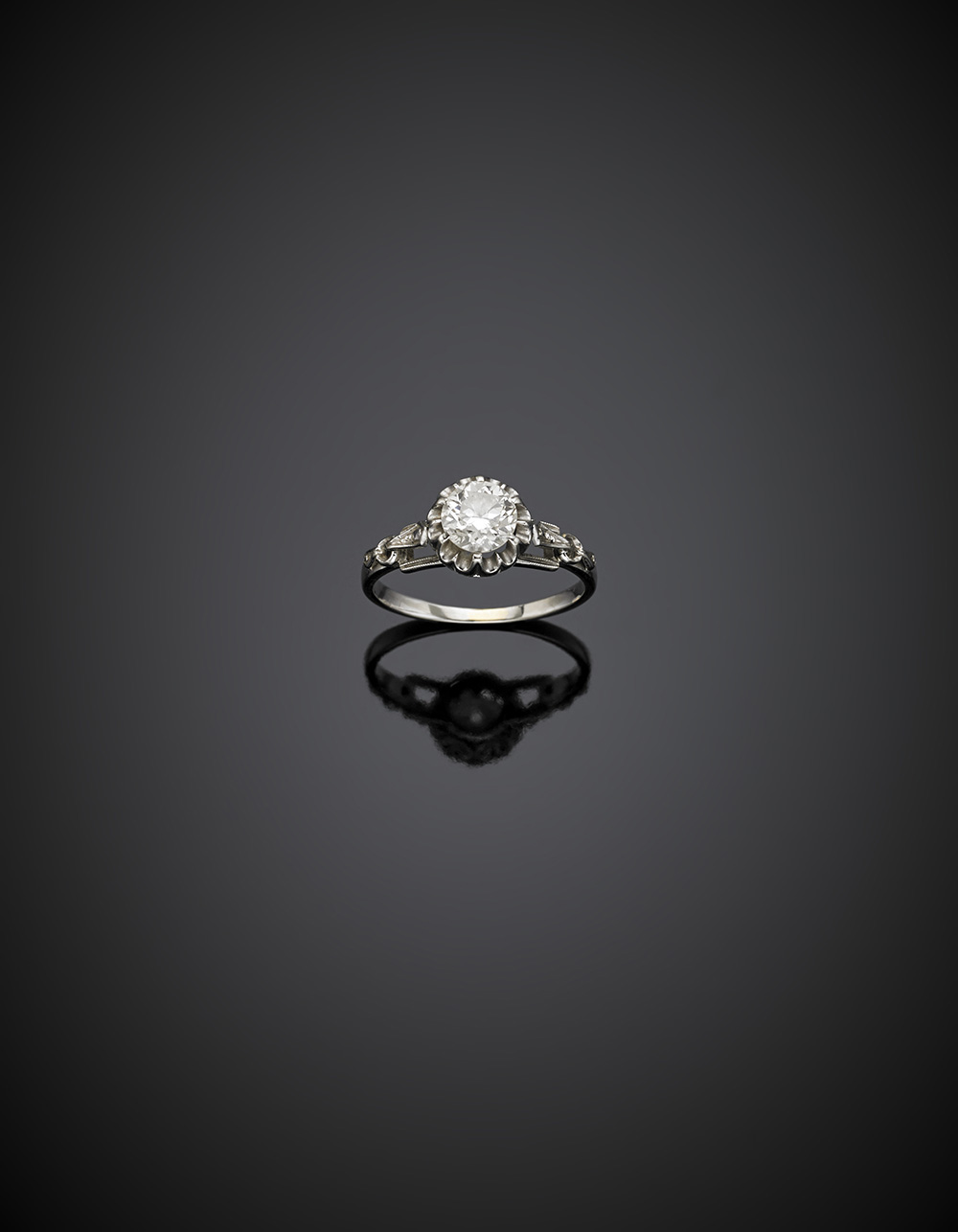 Lot 929 | Anello in oro bianco con diamante solitario di ct. 0,80 circa, g 2,76 misura...
