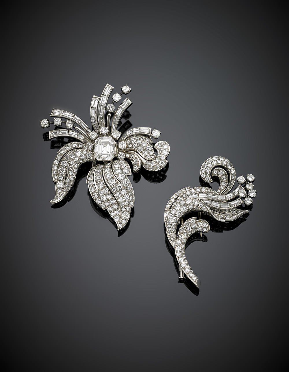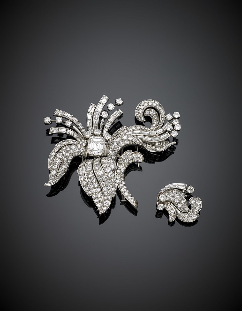 Broche a volute floreali con due spille accessorie in platino e oro bianco, diamanti rotondi e baguette con al centro un diamante ottagonale di ct. 3,57, le spille accessorie possono alternativamente essere unite al corpo principale, per complessivi ct. 13,50 circa, complessivi g 54,01, lungh. cm 6, largh. cm 7 circa.