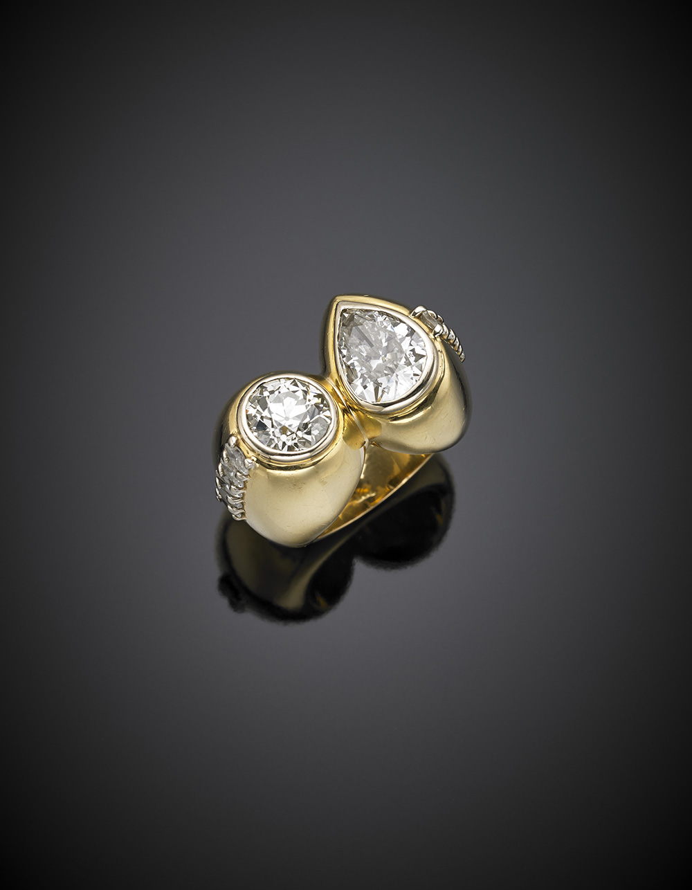 Anello in oro giallo bombato con due diamanti: uno rotondo di ct. 2,30 circa e uno a goccia di ct. 2,50 circa, piccole navette sul gambo, g 25,21 misura 15/55.