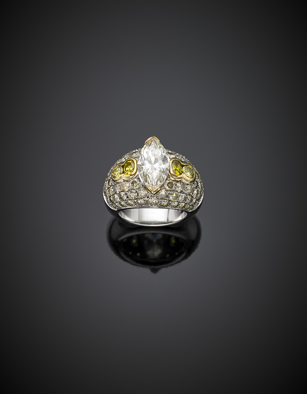 Anello bombato in oro giallo e bianco con pavè di diamanti a sostenere un diamante a navette di ct. 3,38, rifinito ai lati con dei diamanti fancy yellow, rotondi e ovali. diamanti per complessivi ct. 6,70 circa, g 18,61 misura 12/52.