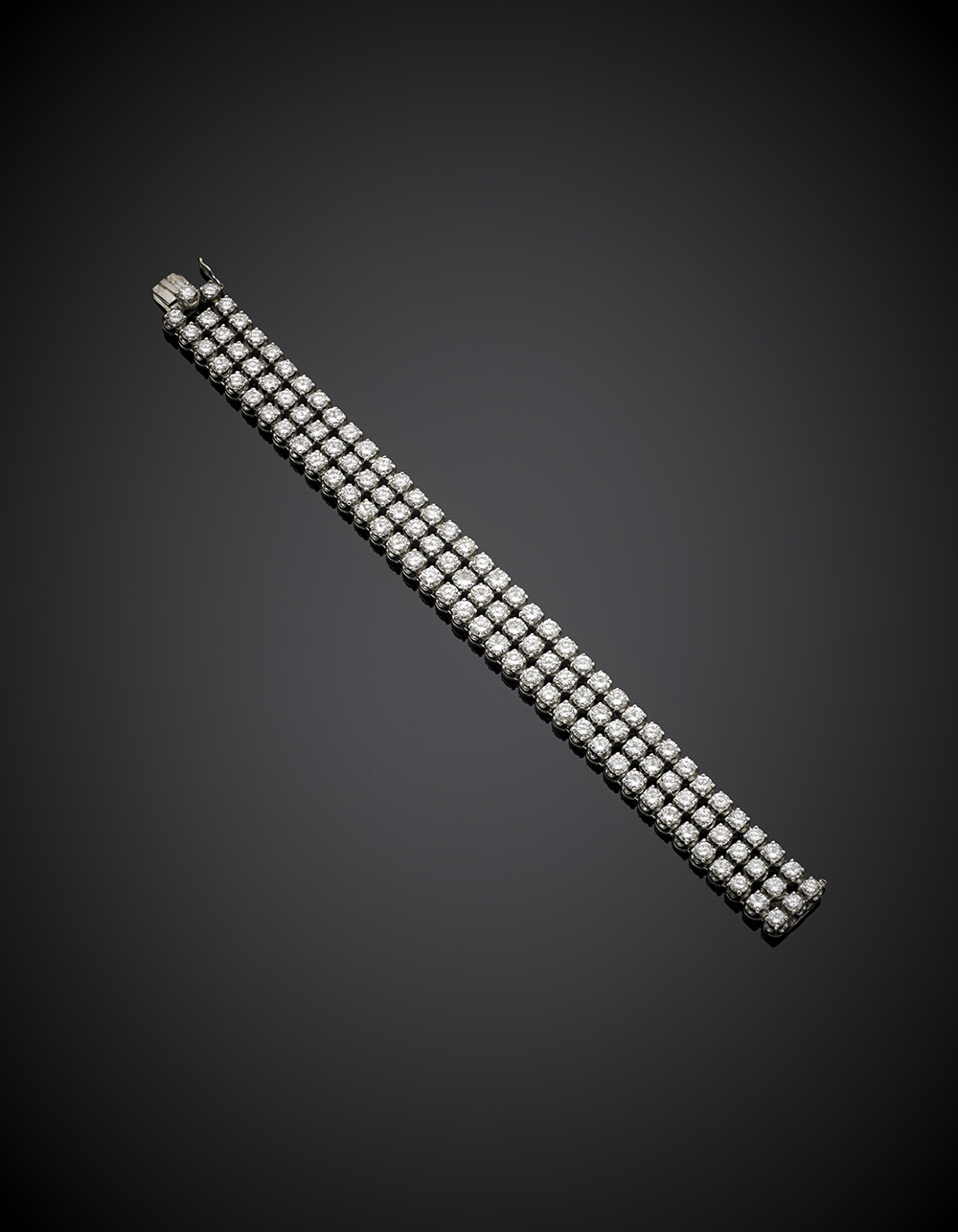 Bracciale in oro bianco a tre file di diamanti rotondi per complessivi ct. 27 circa, g 43,15, lungh. cm 18 circa.