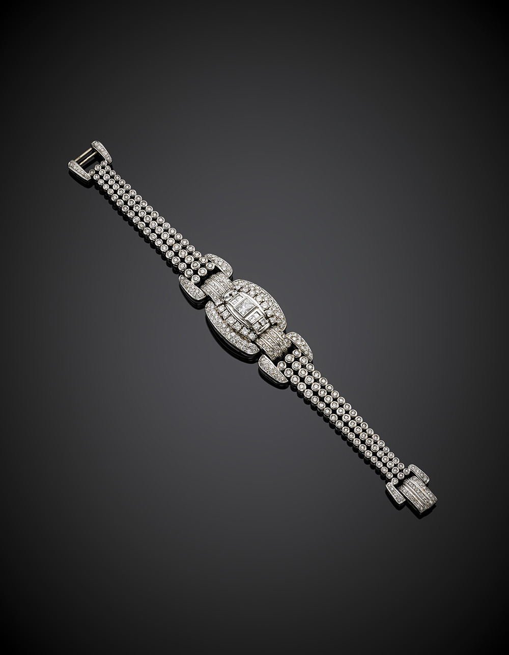 Bracciale in oro bianco con diamanti rotondi per complessivi ct. 10 circa a guisa di cinturino con fibbie a tenere un centrale rifinito con un diamante rettangolare taglio princess di ct. 0,85 circa, g 64,04, lungh. cm 19 circa.