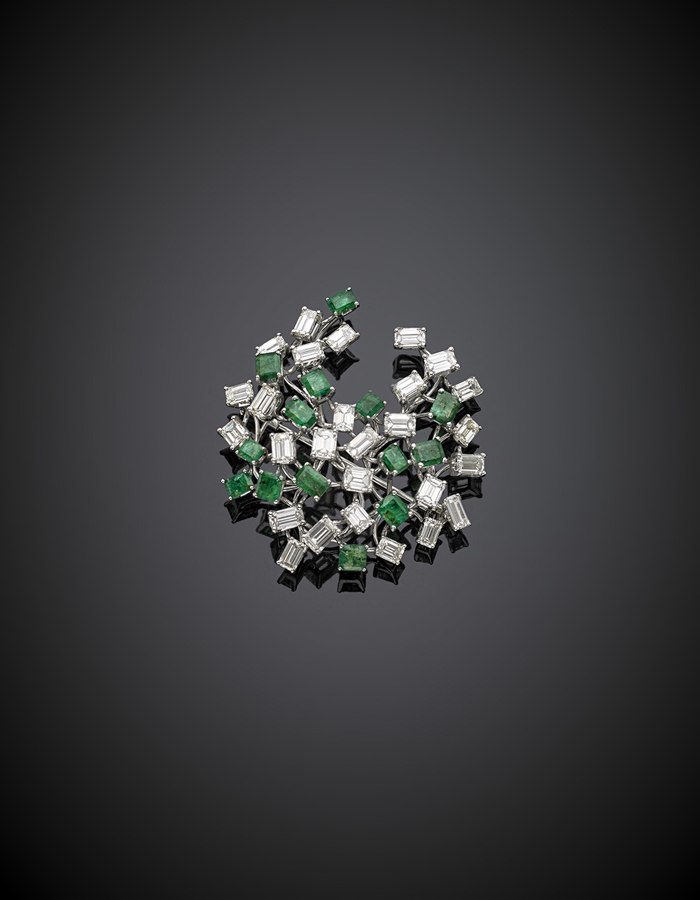 Broche in oro bianco con diamanti e smeraldi rettangolari rispettivamente per complessivi ct. 5,50 circa e per complessivi ct. 3,70 circa, g 17,55, largh. cm 4,70, h cm 4,80 circa.