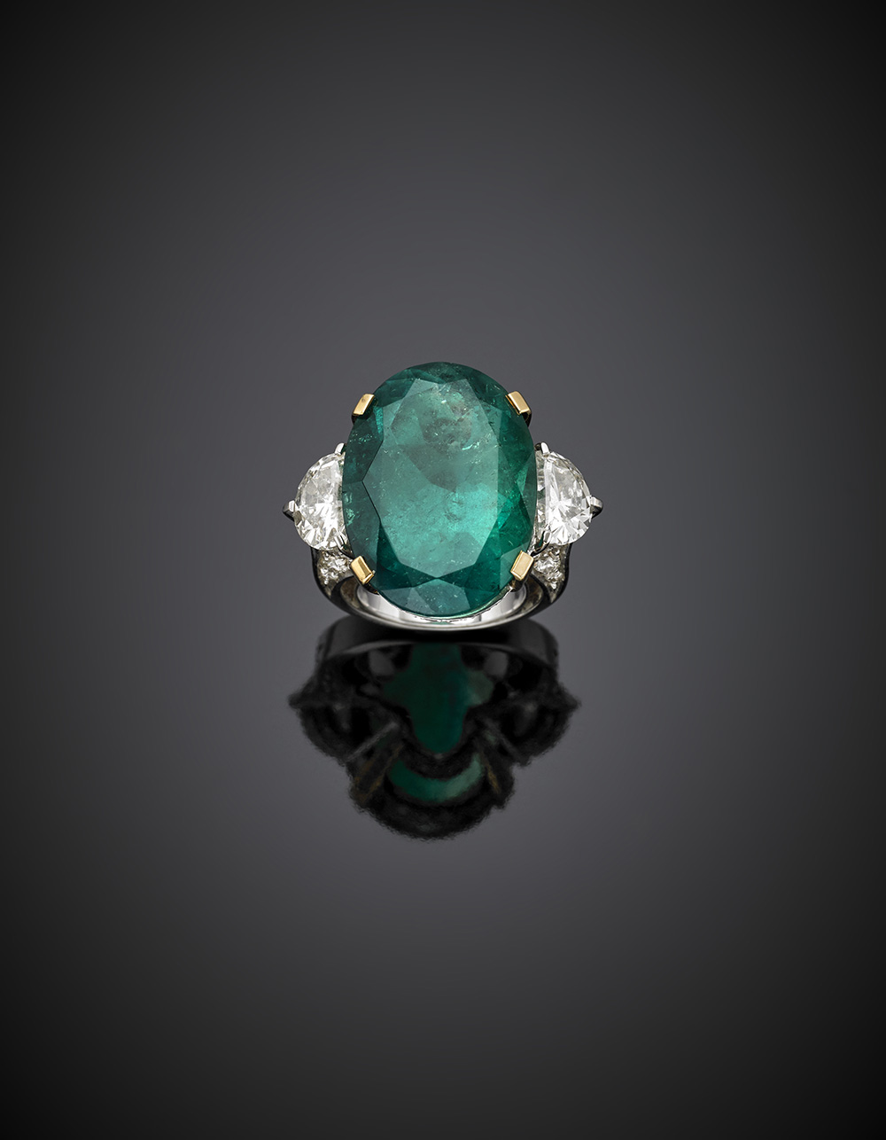 Anello in oro bianco e giallo con smeraldo ovale di ct. 24 circa affiancato da due diamanti a mezzaluna per complessivi ct. 2,70 circa e rifinito con diamanti rotondi, g 14,89 misura 15/55.