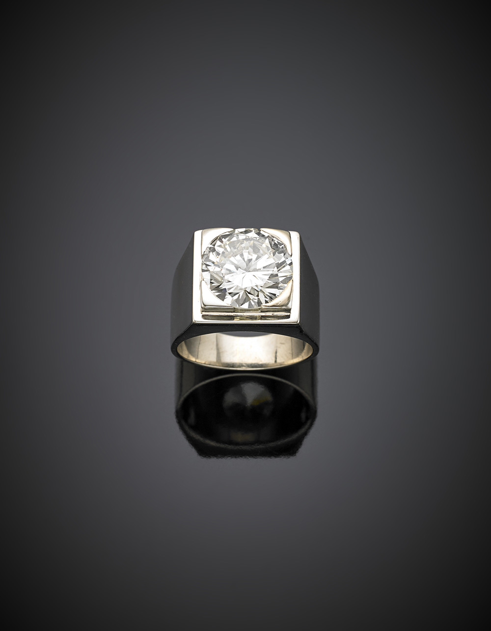 Anello a fascia in oro bianco con diamante rotondo di ct. 5,63, g 11,12 misura 15/55.