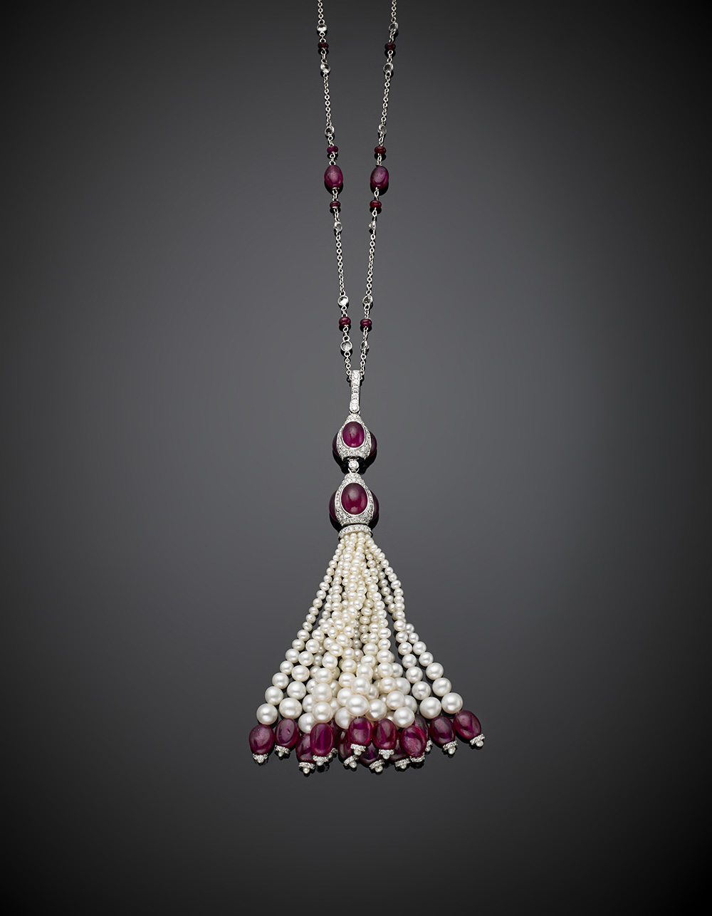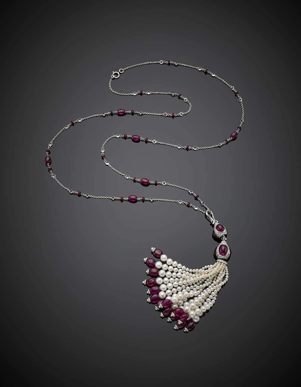 White gold diamond and ruby sautoir with graduated pearl and ruby pendant with tassel, pendant length cm 10.5 circa, g 37.34, length cm 76 circa.
