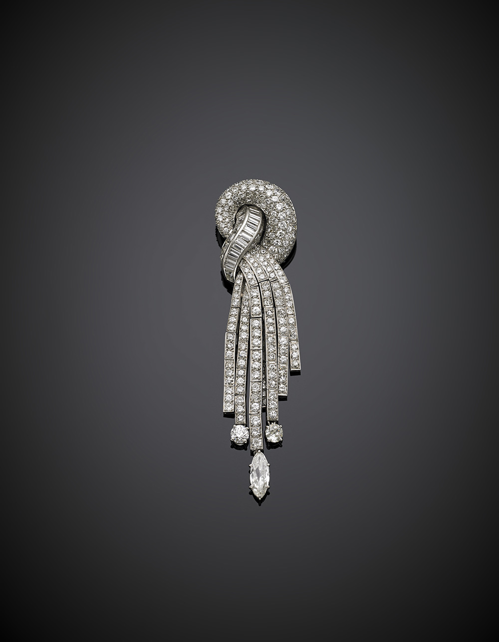 Broche a nodo con nappa mobile in oro bianco con diamanti rotondi, baguette, una navette a rifinire la nappa più lunga, per complessivi ct. 10 circa g 36,95, lungh. cm 9, largh. cm 2 circa.