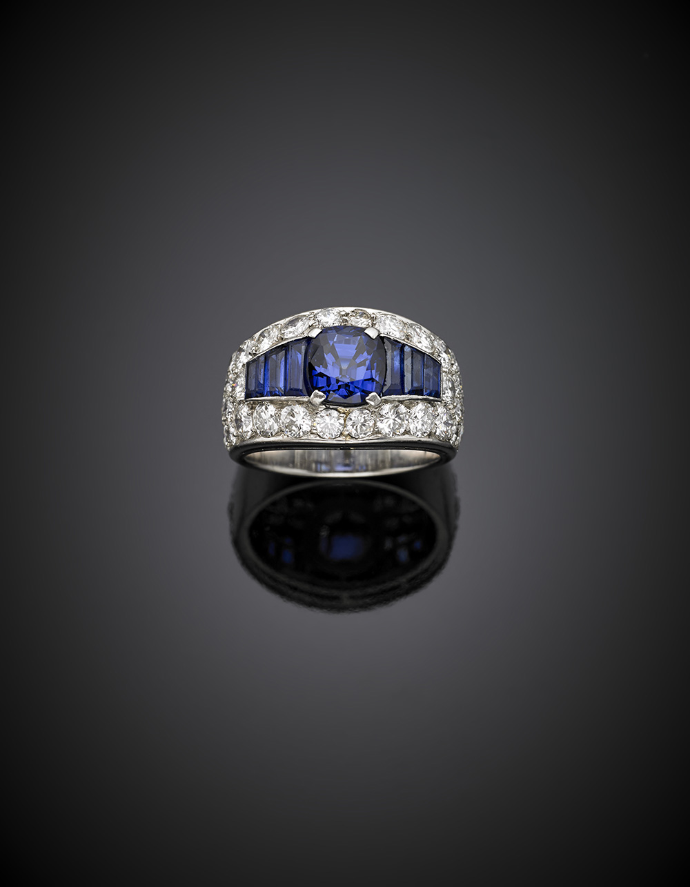 Anello in platino con zaffiri a cuscino e calibré per complessivi ct. 2,7 circa e diamanti rotondi per complessivi ct. 2,20 circa, g 14,3 misura 13/53. Marcato Bvlgari.
