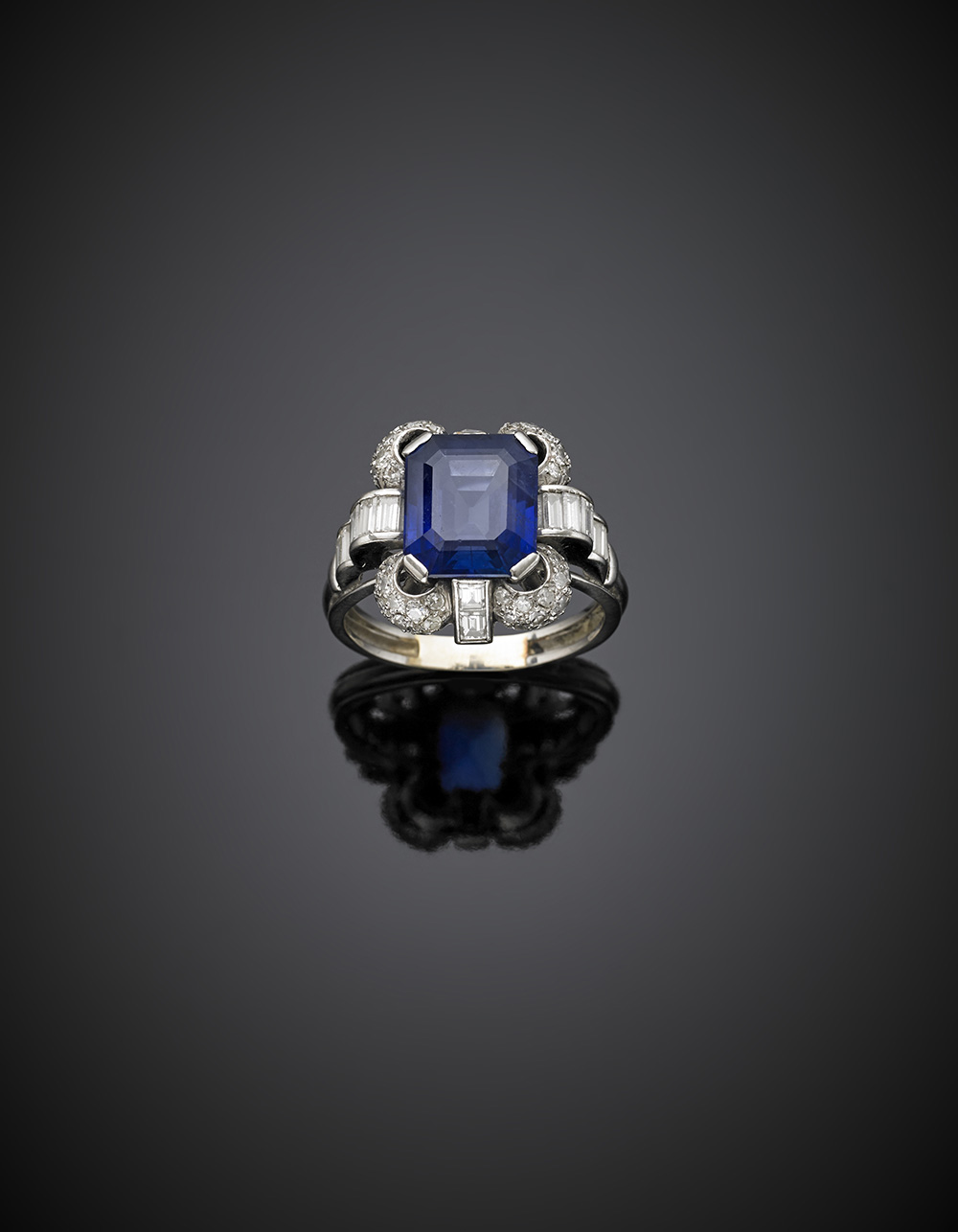 Anello in oro bianco con diamanti baguette e rotondi a contornare uno zaffiro rettangolare di ct. 8,20 circa, g 12,25 misura 24,5/64,5.