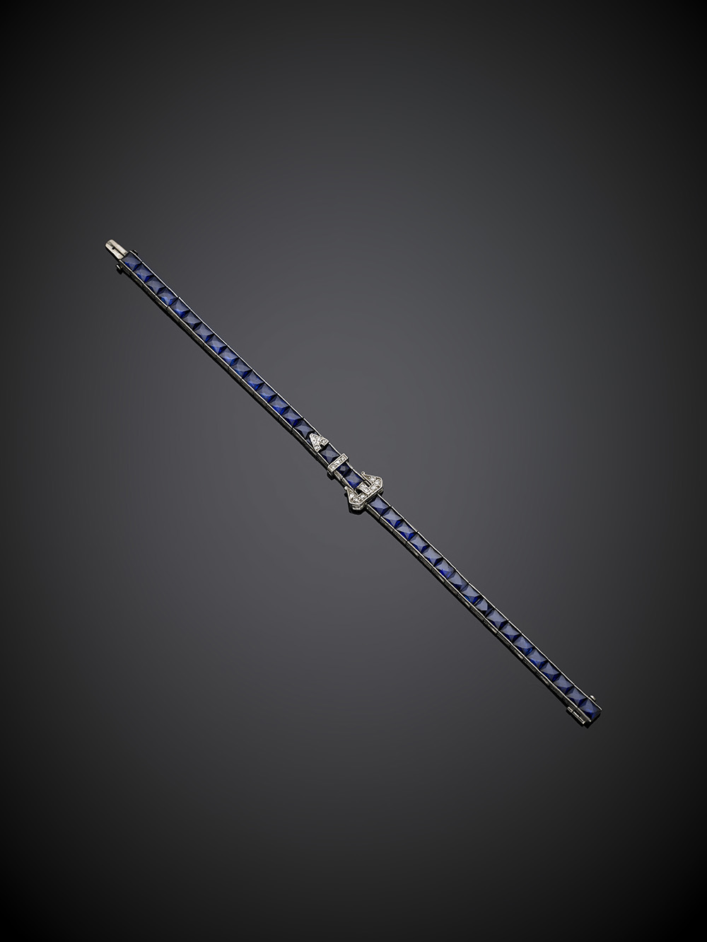 Bracciale a fibbia in platino con zaffiri carrè rifinito in diamanti, zaffiri...
