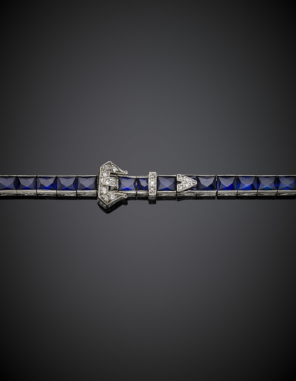 Carré sapphire platinum belt bracelet with rose cut diamond buckle and belt loop, sapphires, in all ct.