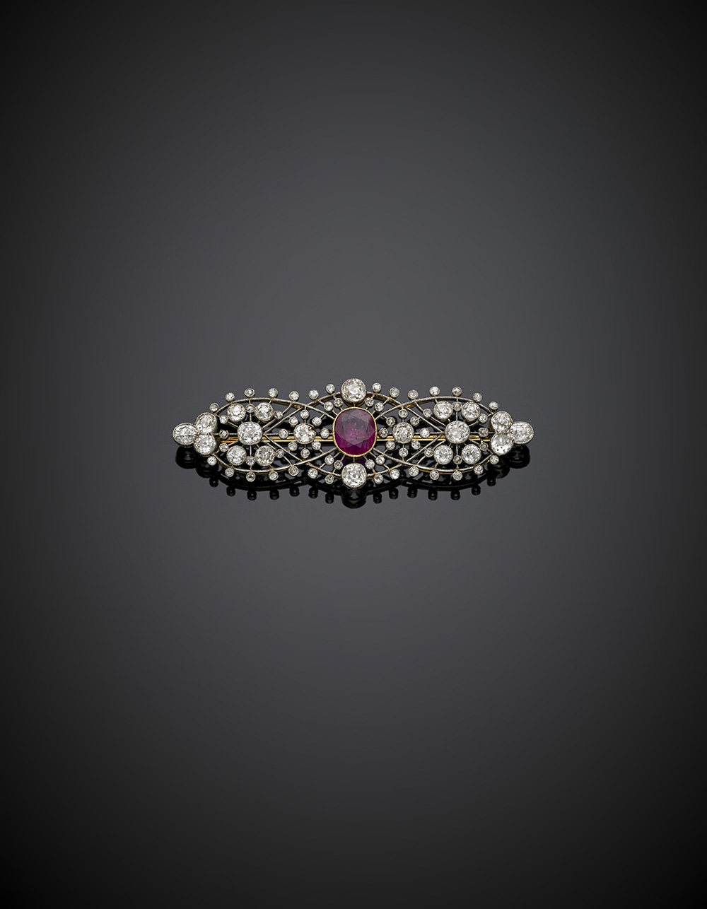 Broche in oro giallo e bianco a losanga traforata,con diamanti rotondi e un rubino a cuscino di ct. 2,25 circa, g 13,73, lungh. cm 7, largh. cm 2,2 circa.