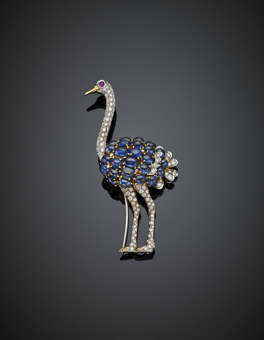 Broche a guisa di struzzo in oro giallo e bianco diamanti rotondi per complessivi ct. 0,80 circa e zaffiri cabochon per complessivi ct. 4,90 circa, un rubino per l'occhio, g 26,37, lungh. cm 7,50 circa. Firmata Missiaglia.