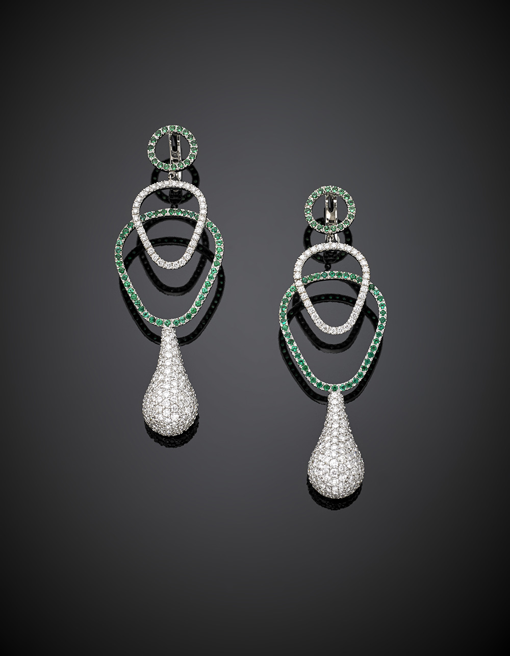 Orecchini pendenti ad anelle in oro bianco e smeraldi a sostenere due gocce con pavé di diamanti, diamanti per complessivi ct. 3,50 circa, smeraldi per complessivi ct. 1,34 circa, g 15,81, lungh. cm 7, largh. cm 2,3 circa. Garanzia originale