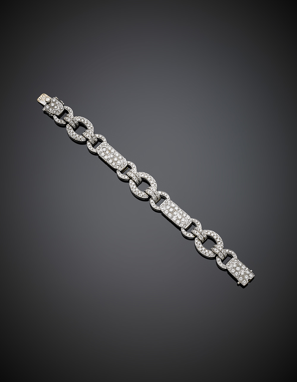 Bracciale modulare in oro bianco e giallo con diamanti rotondi per complessivi ct. 14 circa,