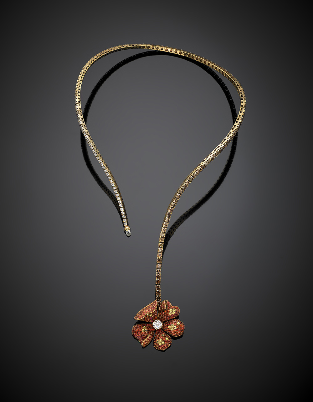 Colourless and tinted diamond yellow gold "torque" necklace, at one end a briolette diamond, at the other a yellow and orange sapphire pavé set flower with a central ct. 0.56 circa diamond, diamonds, in all ct. 11.23 circa, sapphires, in all ct. 7.07 circa, g 39.65, length cm 21, width cm 10.5 circa. Original Guarantee