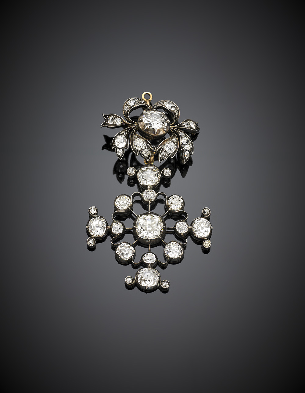 Pendente in oro, argento e diamanti, i due diamanti centrali di forma a...