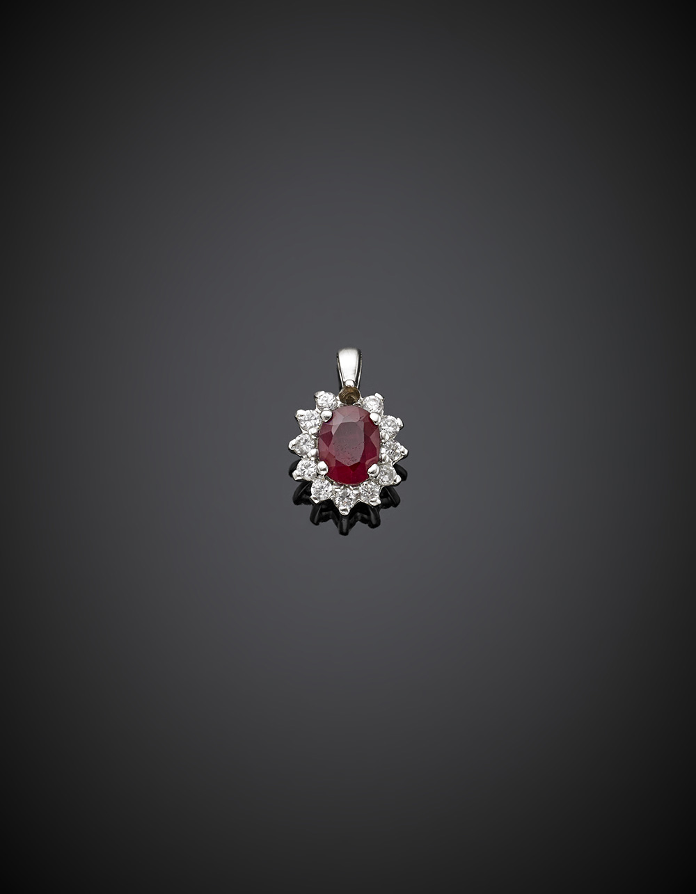 Pendente in oro bianco con diamanti e rubino ovale (Sintesi di fondente o trattato con fondente) g 2.55 lungh cm 1.7