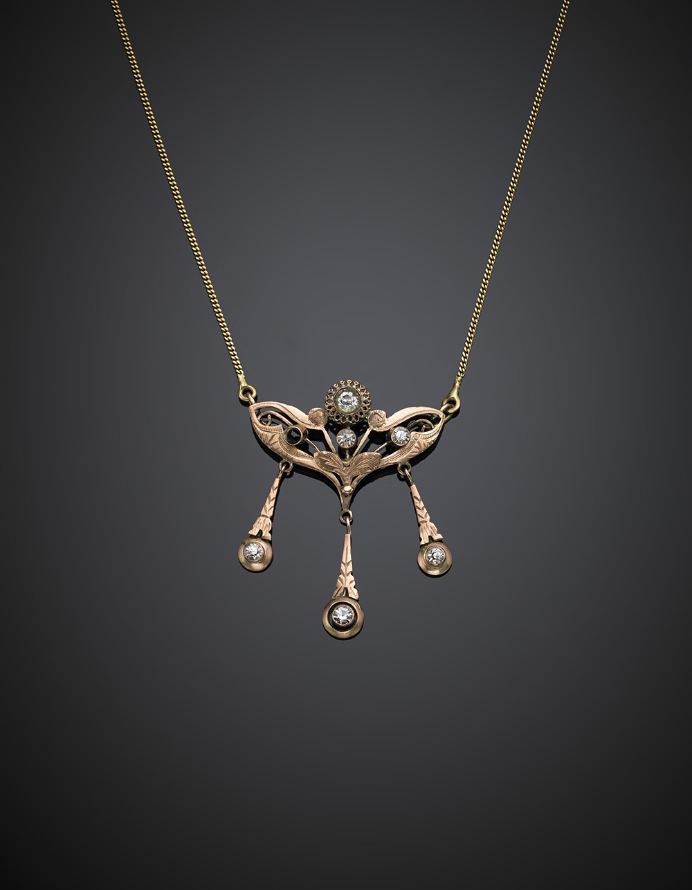 Catenina in oro giallo con centrale in oro rosa 333/1000 rifinito con strass, g 6,43, lungh. cm 41 circa.
