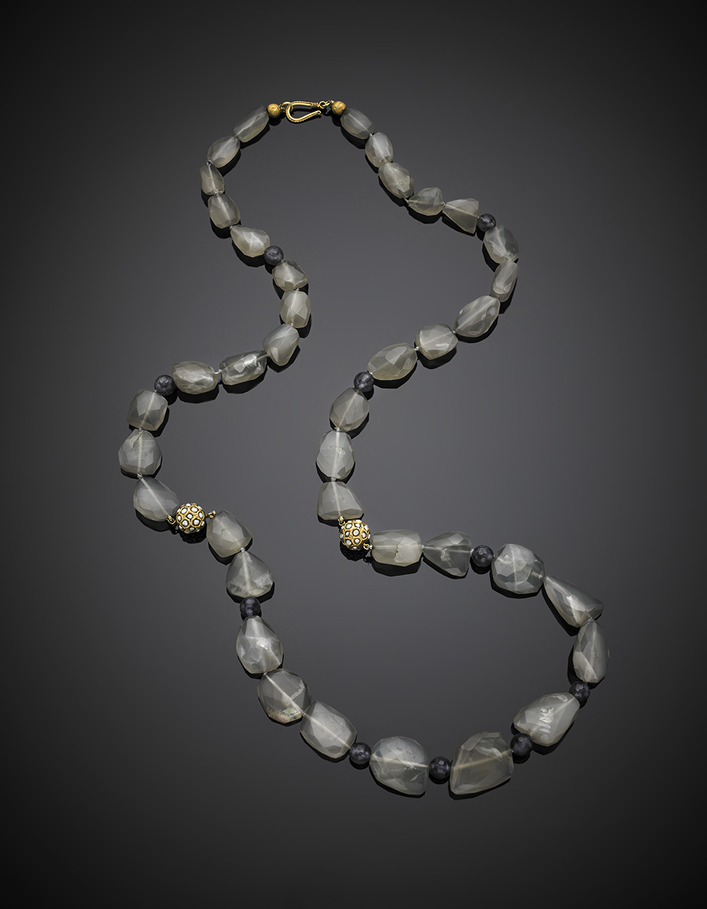 Collana in boules sfaccettate di labradorite e boules di cordierite, chiusura in oro giallo,
