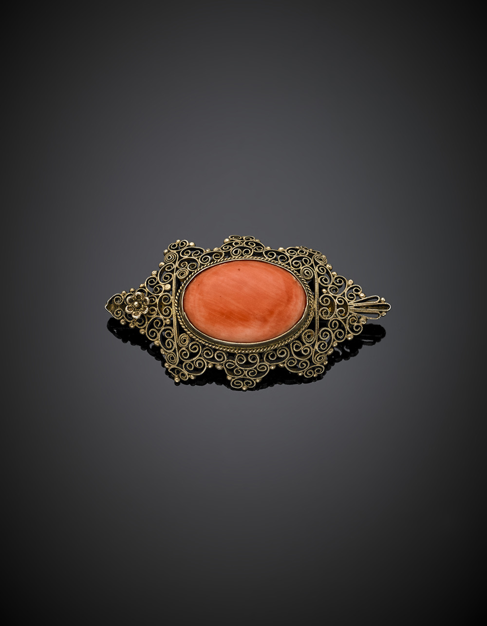 Spilla in filigrana d'argento dorato con cabochon di corallo rosa arancione di mm 21,25x14,90 circa, g 8,64, lungh. cm 5, largh. cm 2,8 circa. (lievi difetti)