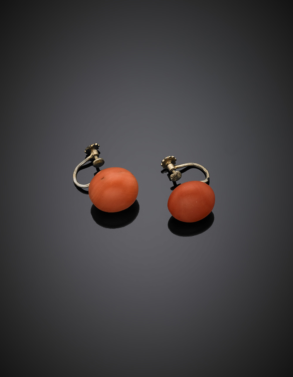 Orecchini con due coralli rotondi a bottone di mm 14,14, g 6,54.