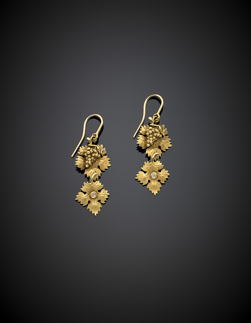 Lot 1040 | Orecchini pendenti in oro giallo a guisa di foglie di vite, g 6,37, lungh. cm...